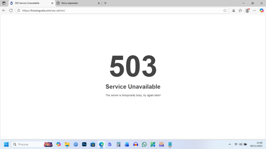 Inicialmente, a mensagem que recebíamos sempre que tentávamos acessar o painel administrativo do site era de que o servidor estava temporariamente indisponível ou a demorar muito tempo a responder as requisições de acesso (connection timeout).